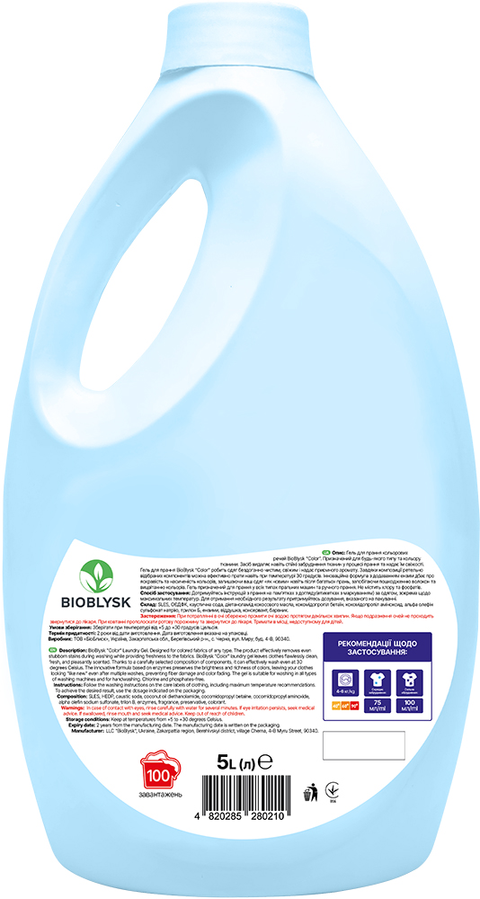 Designed for any type and color of the fabric. The product removes even persistent tissue contamination during the washing process and gives them freshness. Washing gel BioBlysk “Color” makes the clothes flawlessly clean, fresh and give a pleasant aroma. Thanks to the composition of carefully selected components, you can effectively wash even at a temperature of 30 degrees. An innovative formula with addition enzyme takes care of the brightness and color saturation, leaving your clothes "as new" even after many washes, preventing fiber damage and color fading. The gel is designed for washing in all types of washing machines and hand washing. Does not contain chlorine and phosphates.