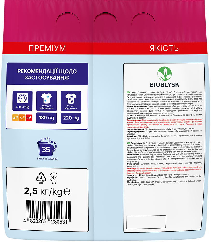 Designed for washing all colored things. This is a highly effective powder that copes with pollution of any complexity. The formula is developed on the basis of 85% of biosoluble components. Does not contain chlorine and phosphates. An innovative formula with addition enzyme takes care of the brightness and color saturation, leaving your clothes "as new" even after many washes, preventing fiber damage and color fading.