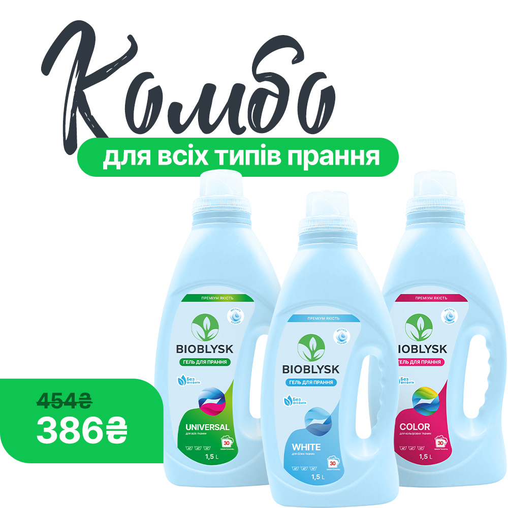 • Wipe gel “Color” BioBlysk 1.5 liters – specially designed for colored linen. Preserves the brightness of the color, protects against fading and prolongs the service life of things.