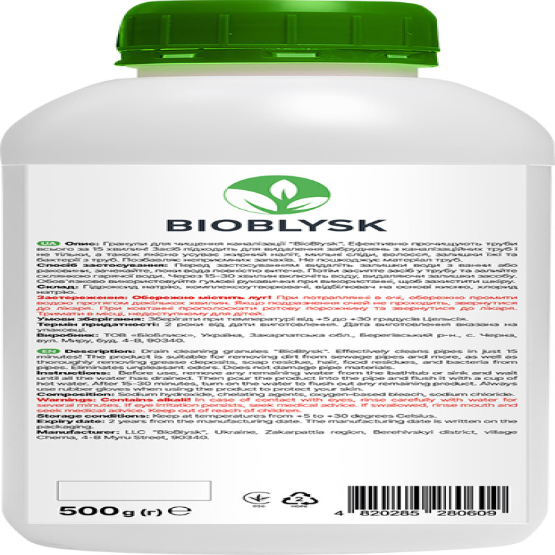 Effectively clean pipes in just 15 minutes! The product is suitable for removing dirt from the sewer pipes and not only, but also qualitatively eliminates oily plaque, soap marks, hair, food residues and bacteria from the pipes. Deprives unpleasant odors. Does not damage the material of the pipes.