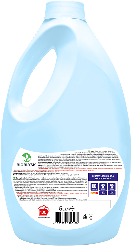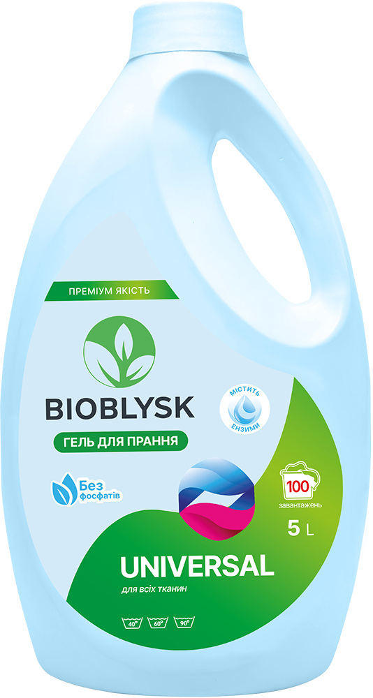 Designed for washing all types of fabrics and types of linen. BioBlysk “Universal” is an innovative solution for effective and safe washing, makes clothes flawlessly clean, fresh and give a pleasant aroma. Thanks to the composition of carefully selected components, the product is effective even at a temperature of 20 degrees. An innovative formula with addition enzyme takes care of the brightness and color saturation, leaving your clothes "like new" even after many washes, preventing fiber damage. The gel is designed for washing in all types of washing machines and hand washing. Does not contain chlorine and phosphates.