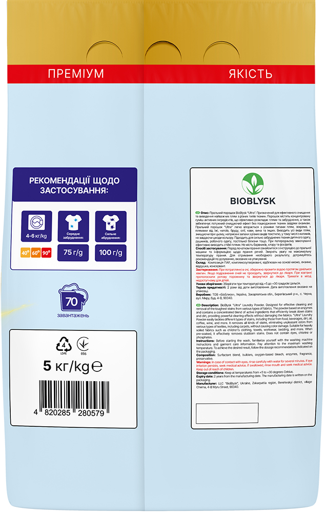 Designed for effective cleansing and removing the most difficult spots from different types of fabrics. The powder contains a concentrated mixture of active ingredients, which effectively decomposes stains and dirt, and also provides a powerful cleansing effect without tissue damage thanks to enzymes. Washing powder “Ultra” can easily cope with different types of stains, in particular, with stains from food, drinks, dirt, oil, coffee, wine and others. Removes all types of stains, while destroying unpleasant odors from different types of textiles, including carpets, without harming color. Suitable for heavily soiled fabrics of children's clothing, towels, work clothes, bed linen, etc. With preliminary soaking, it effectively removes persistent stains. Not a capacity of dyes, chlorine and phosphates.